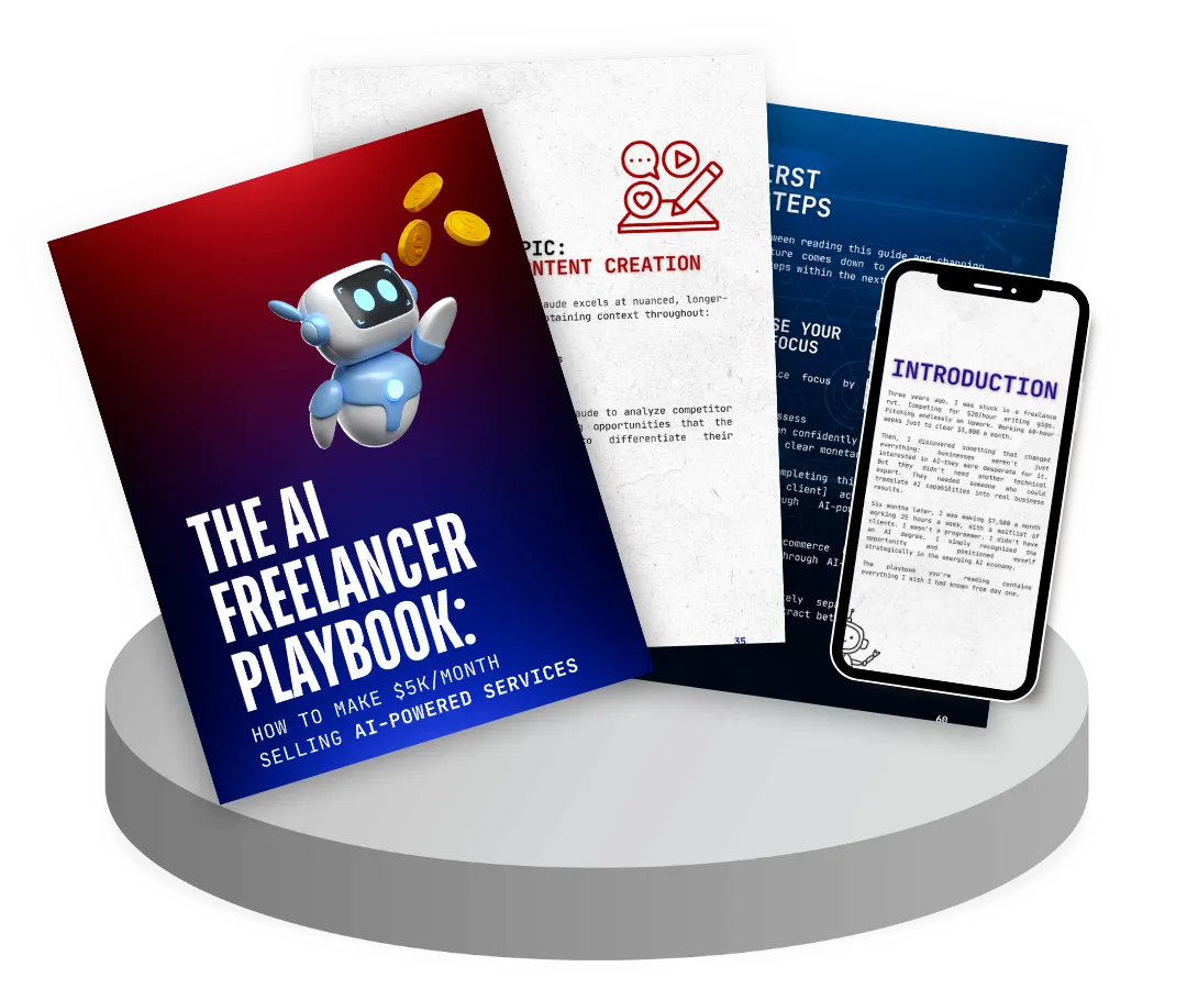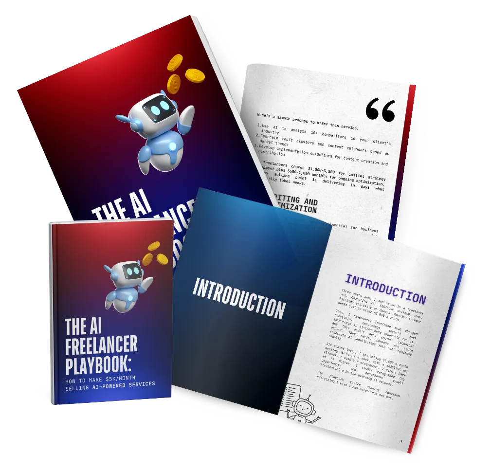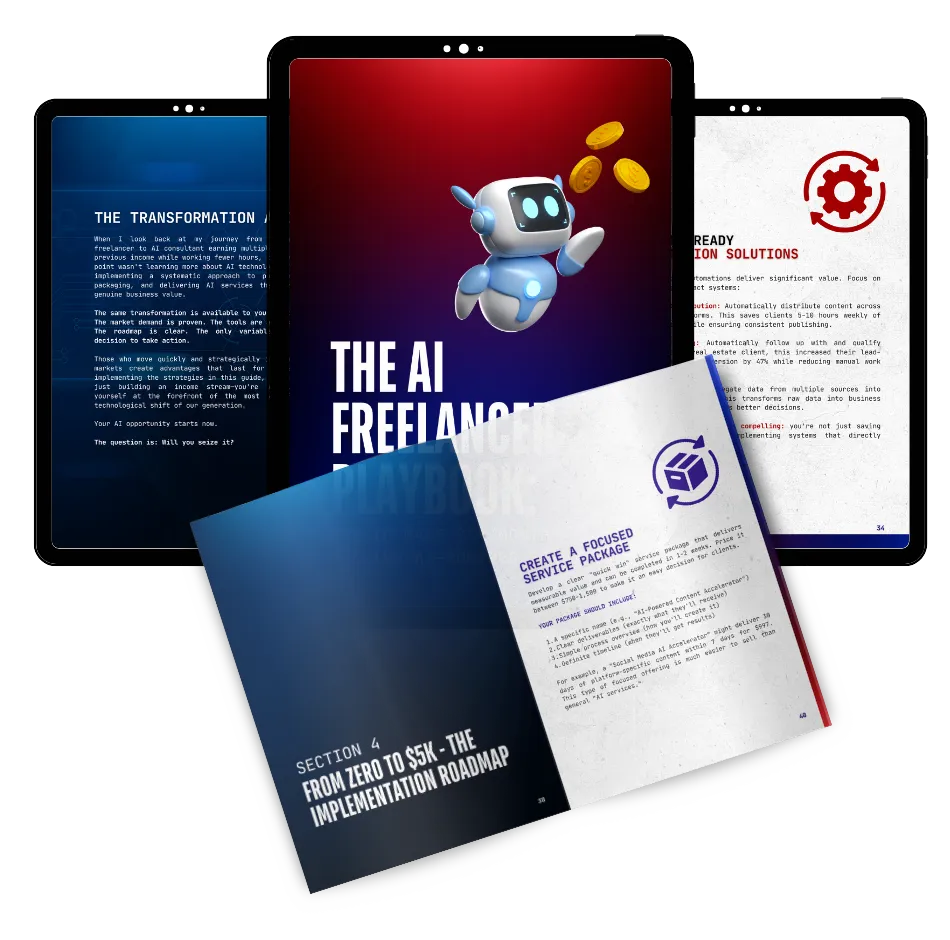 The AI Freelancer Playbook is ideal for freelancers struggling with price competition and inconsistent income. It's perfect for professionals who want to escape the 9-5 and build a flexible $5K+ monthly business. If you're concerned about AI replacing your job and want to get ahead of the curve, this is for you. It's also designed for side-hustlers looking for a proven system to generate premium income without technical skills. This is NOT for people looking for passive income with zero effort, those unwilling to learn new tools, or anyone expecting overnight success without implementing the strategies.